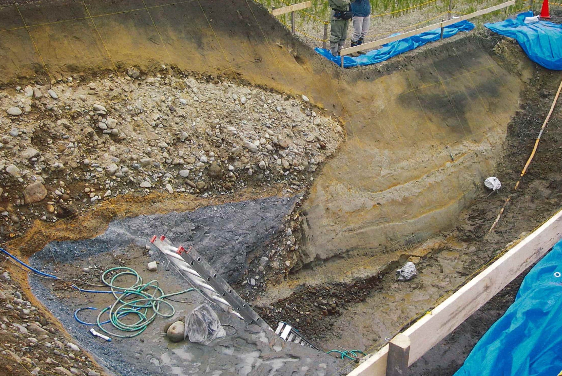 こうして断層の位置を確定し、最後にトレンチを掘削して人の目で断層の状態を確認します。下の写真を見るとわかるとおり、トレンチの断面では堆積層の変位の様子がはっきりとわかります。