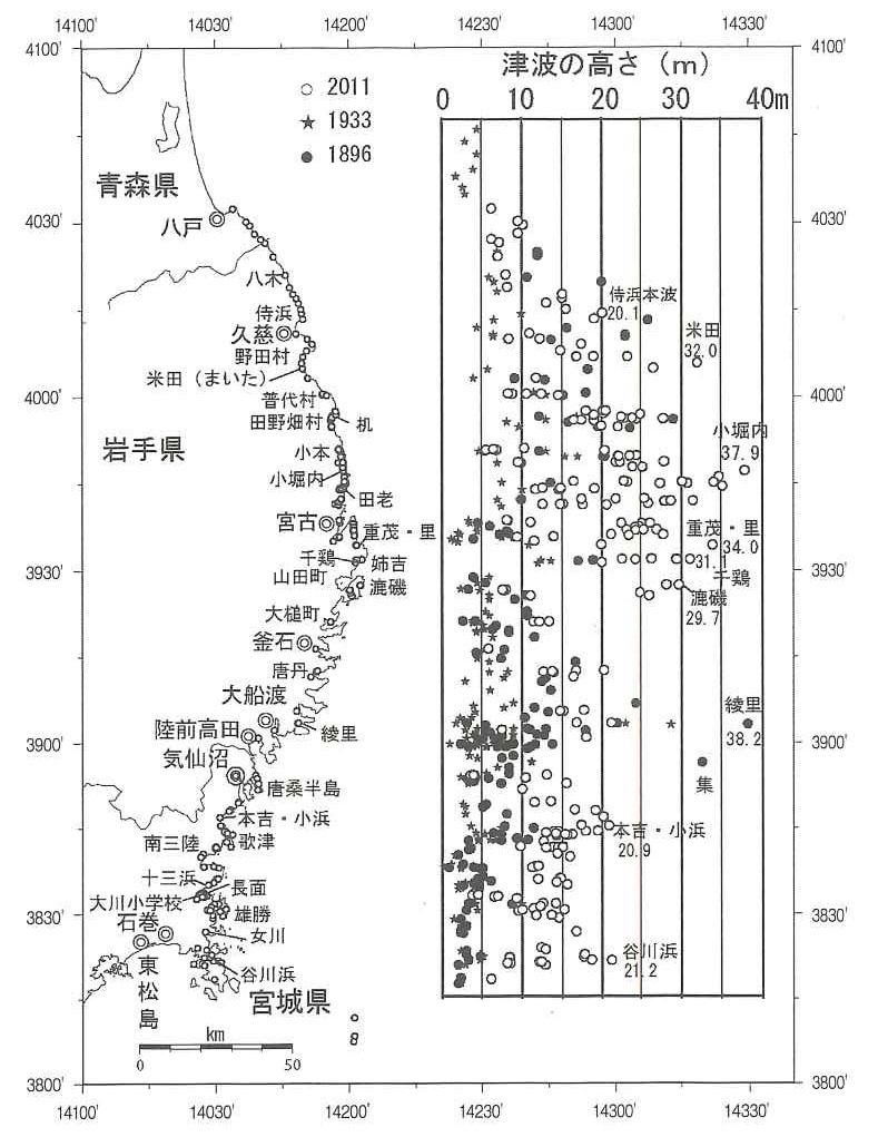 下の図は、東京大学地震研究所による、三陸沿岸での明治三陸津波(黒丸●)、昭和三陸津波(黒星★)、東日本大震災津波(白丸○)の津波浸水高を比較したデータです。今回の津波が、前二回の三陸津波よりもはるかに高かったことが一目瞭然です。