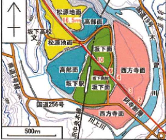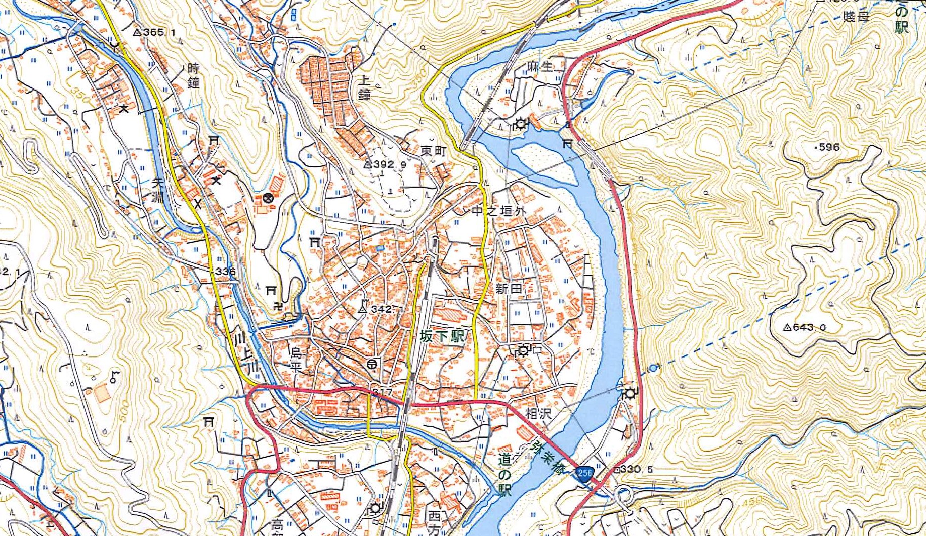 坂下駅周辺には木曽川の河岸段丘が発達し、4つの段丘面があります。坂下駅を出発した中央本線は、駅からおよそ300mで比高10mほどの崖にぶつかり、そのままトンネルに入ります。この崖は北西-南東方向に連続し、坂下の町を横断し、さらに木曽川を越えて対岸に続いています。