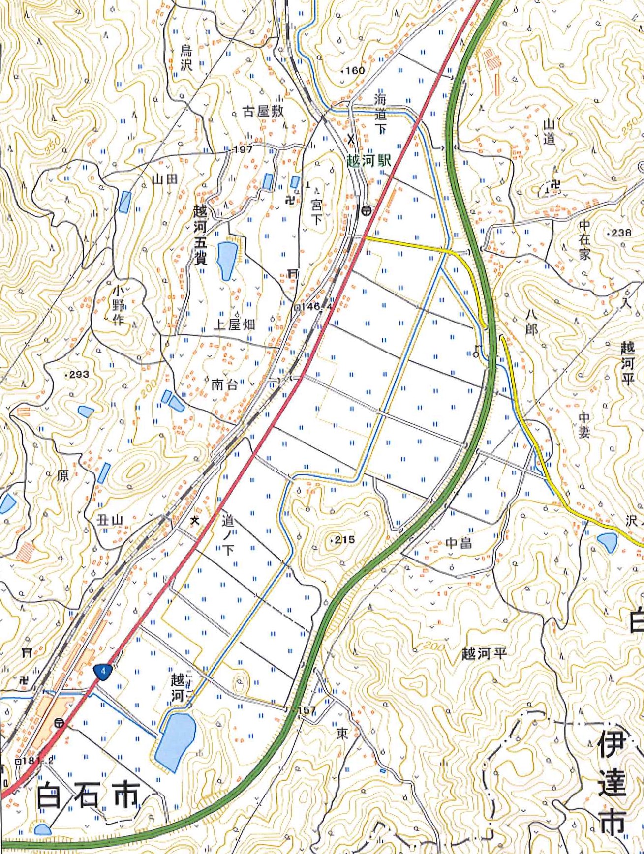 次の図は宮城県白石市越河地区の地形図です。ここは東北自動車道で国見ICから下ってくると左側に田んぼが広がる小さな盆地としてよく見えます。さらに下ると再び山に入り、やがて白石盆地に出ます。